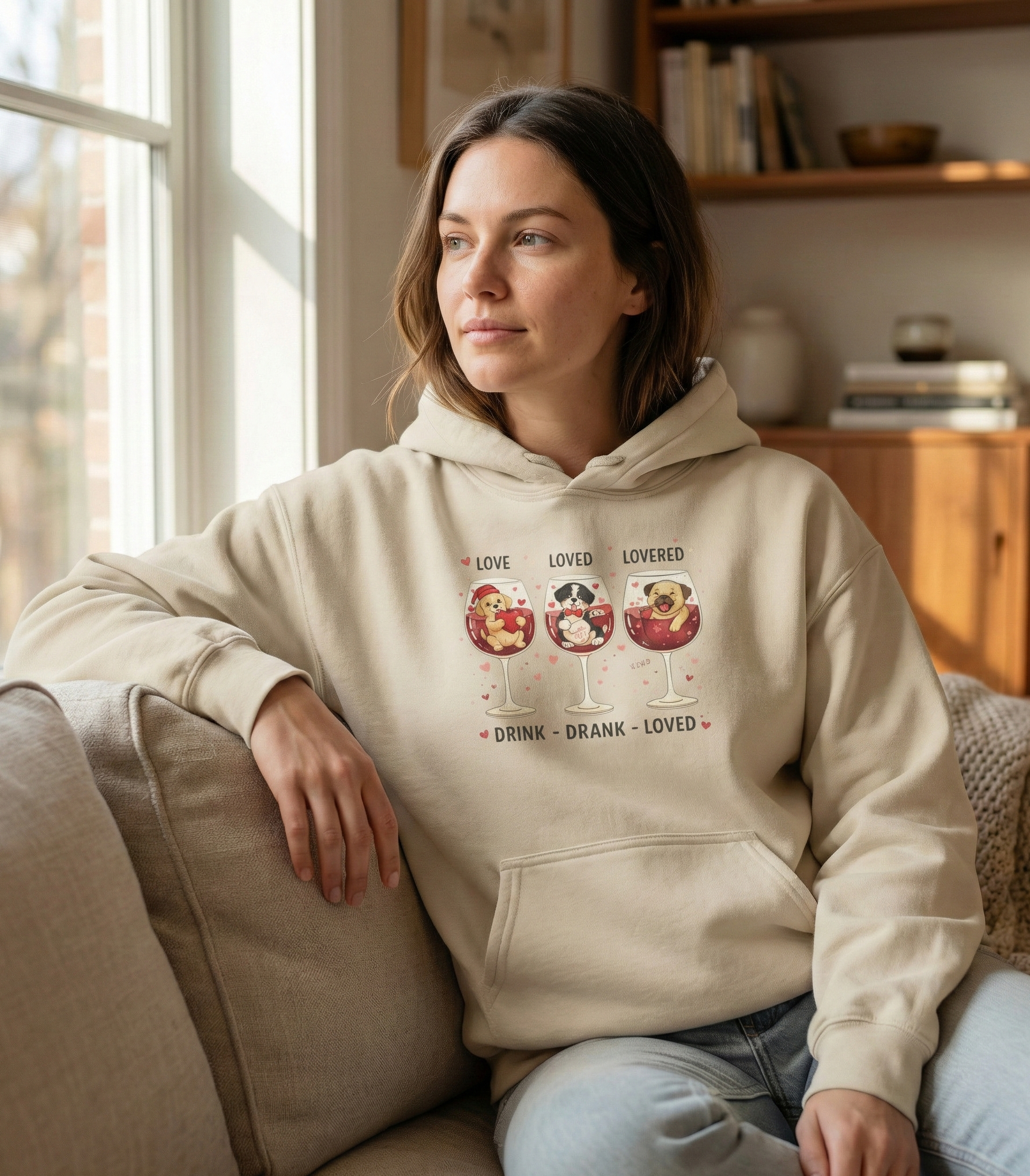 This collection is the go-to choice for Galentine’s Day brunches, casual wine tastings, or simply curling up on the sofa with your own furry friend. It’s a standout gift for dog moms and wine enthusiasts who prefer a touch of humor over traditional roses. Whether you're pairing the white crewneck with leggings for a clean aesthetic or the sand hoodie with denim for a weekend outing, you’ll be wearing the "heart" of your lifestyle on your sleeve.