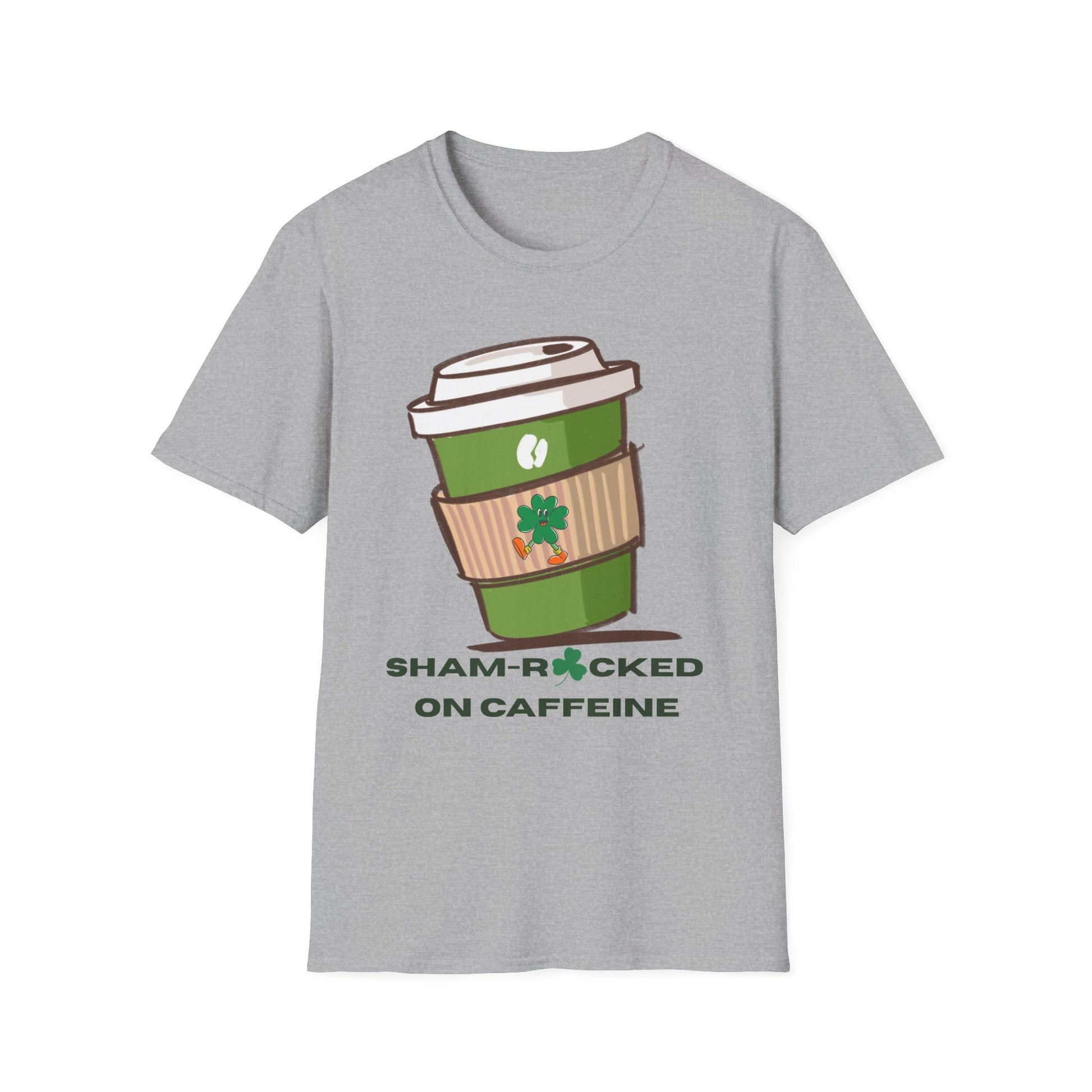 Start your day the lucky way with this playful “Sham-Rocked on Caffeine” t-shirt. Featuring a fun green coffee cup design with a shamrock detail, this graphic tee blends St. Patrick’s Day spirit with coffee lover humor for the perfect festive look.