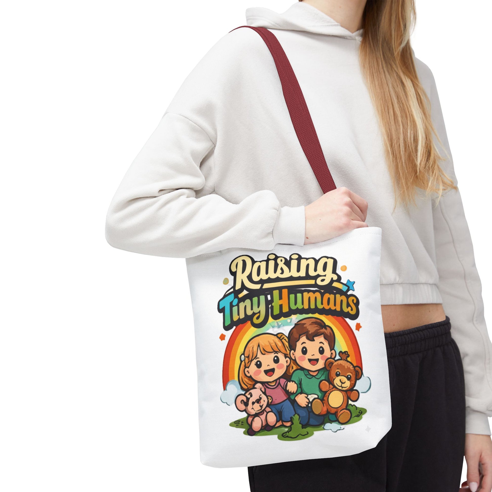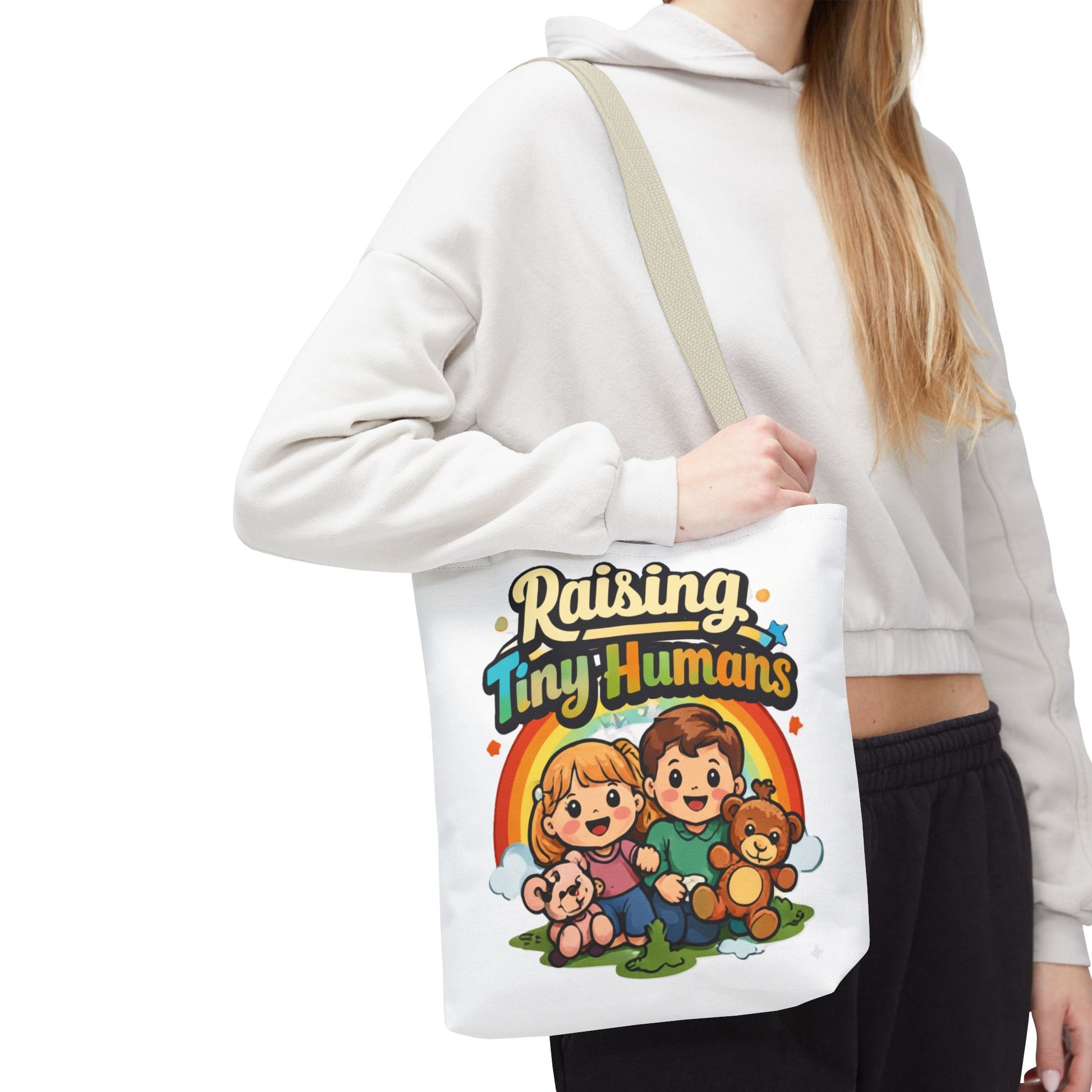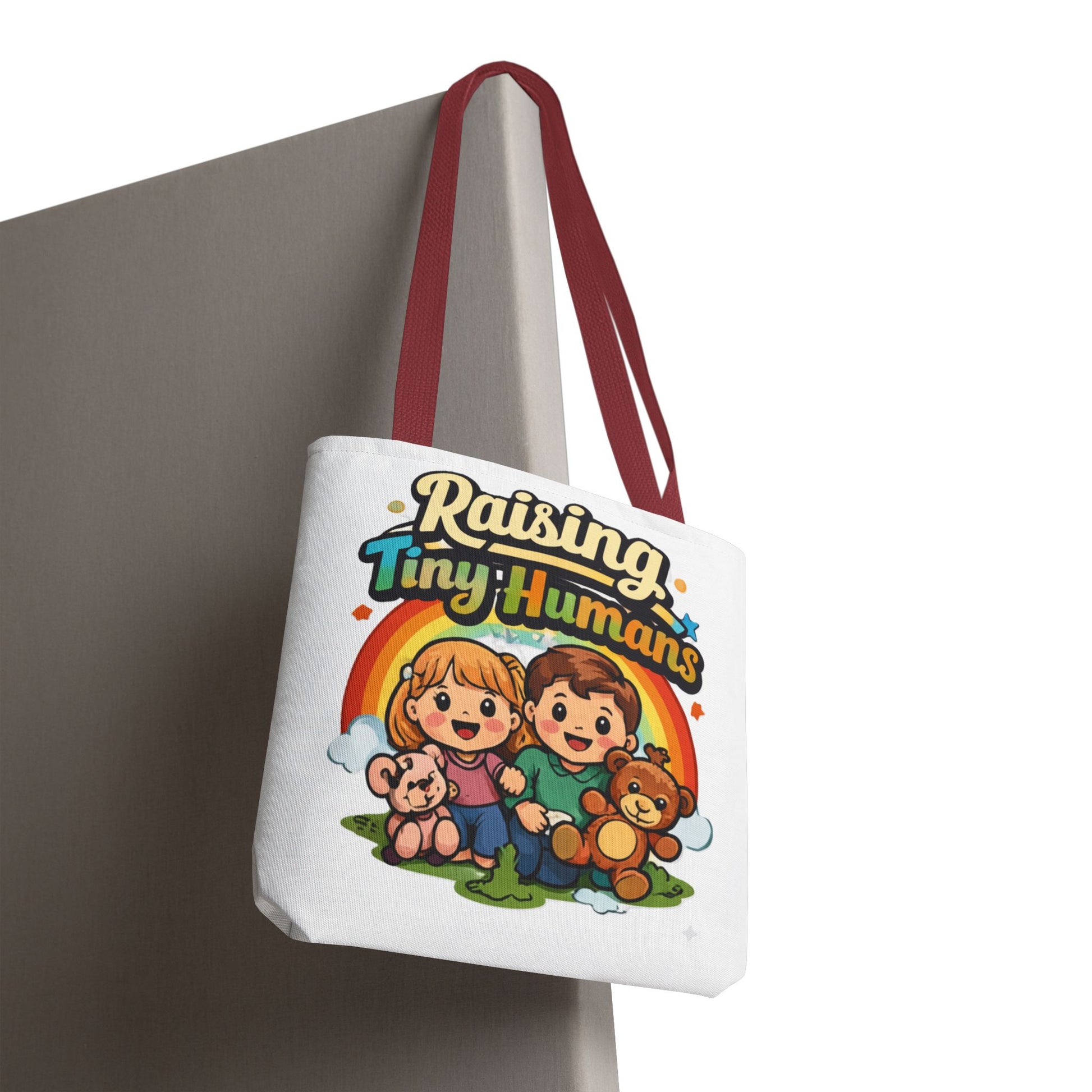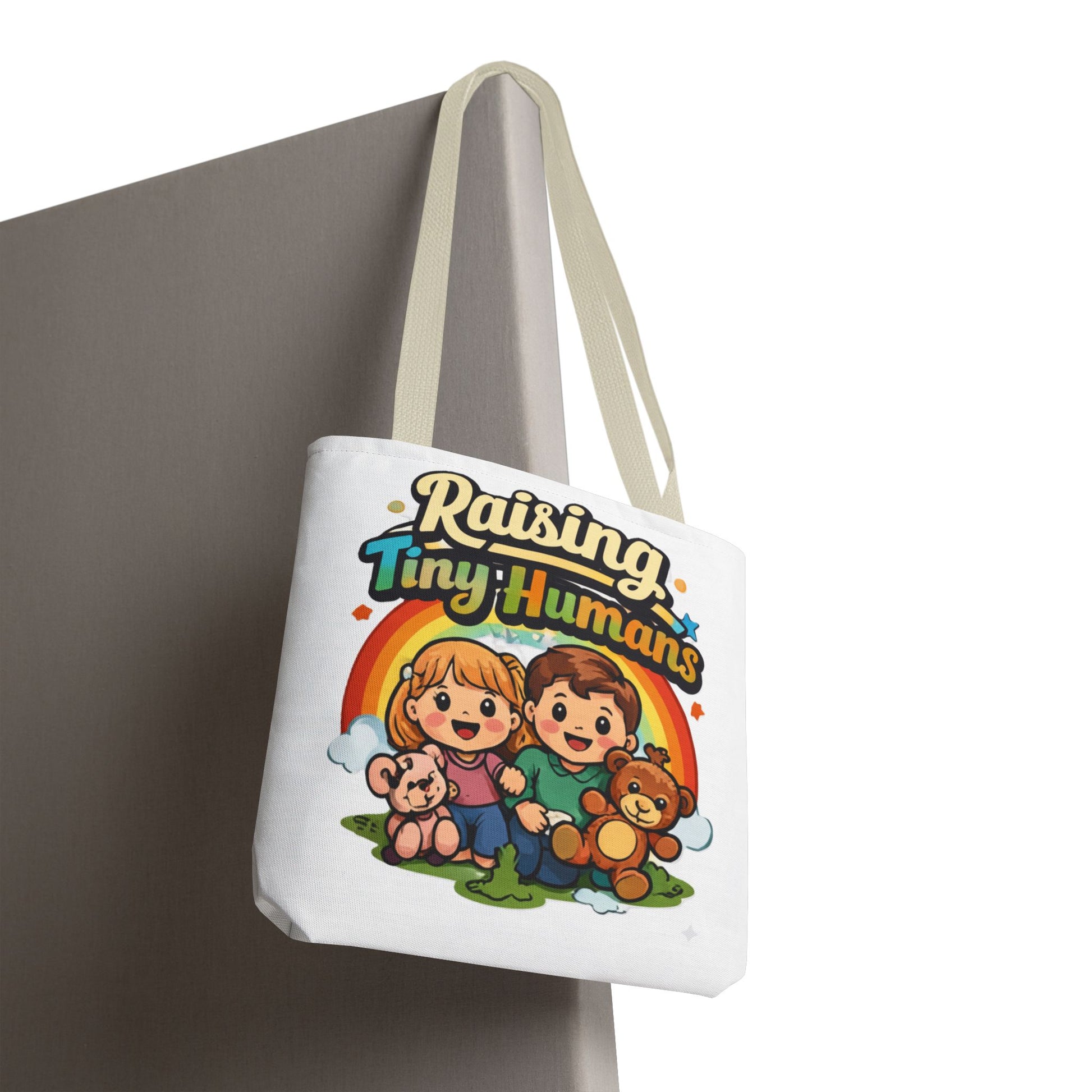 The βRaising Tiny Humansβ artwork makes this bag instantly relatable and gift-worthy.