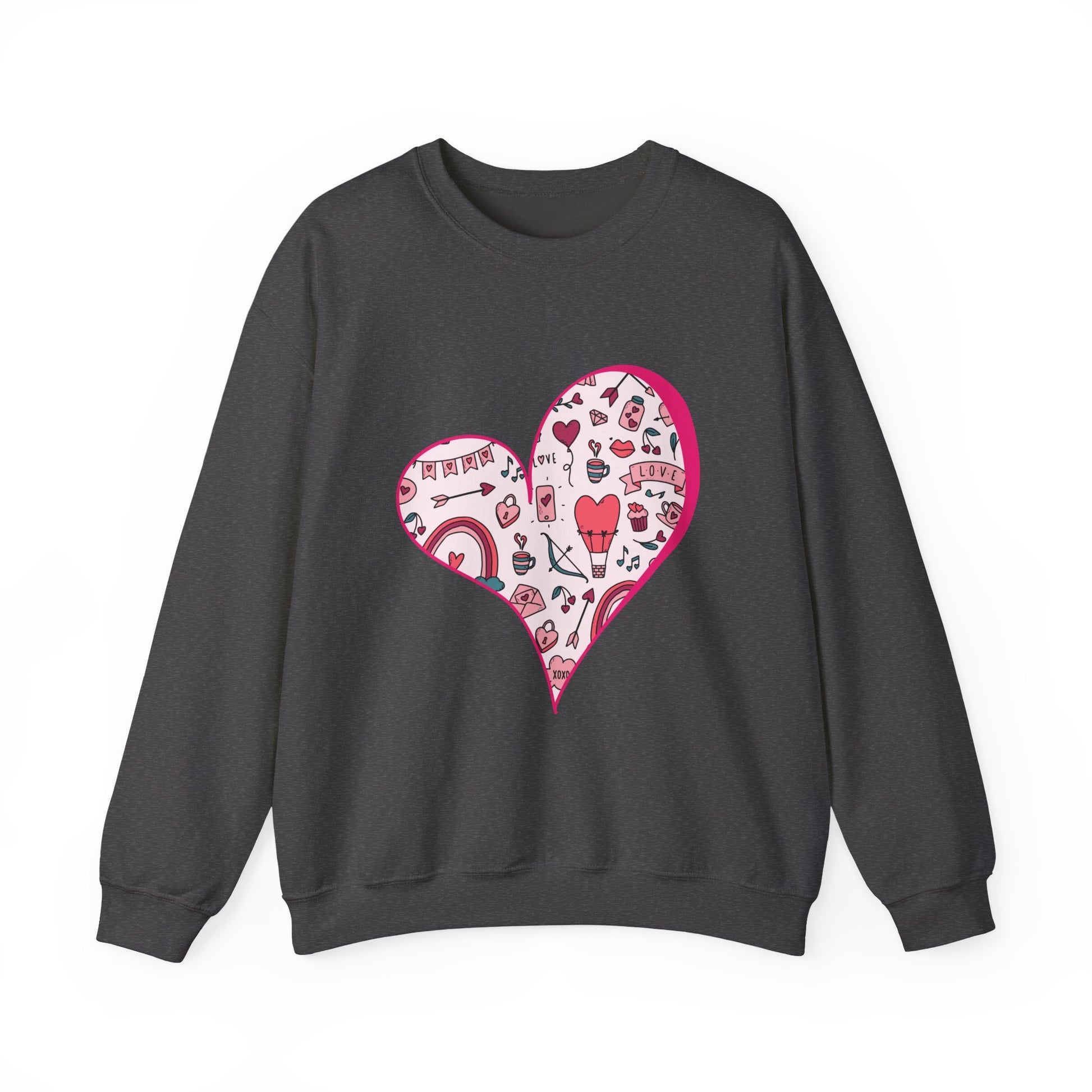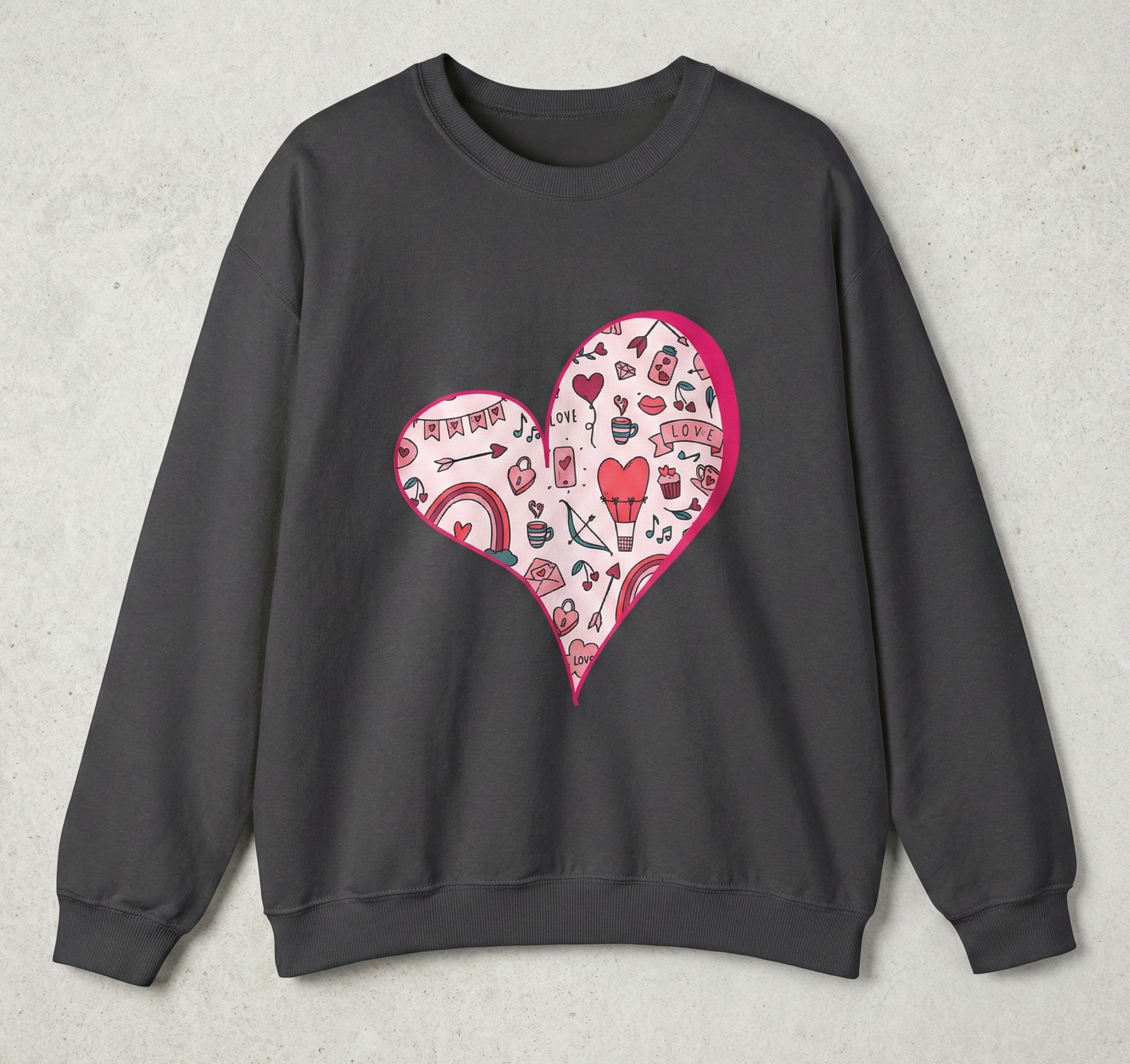 Add warmth and charm to your wardrobe with this Valentine heart sweatshirt, featuring a bold heart-shaped graphic filled with playful love doodles. From hearts and rainbows to coffee cups, arrows, music notes, and sweet Valentine icons, this design captures the fun, cozy chaos of love in a modern, wearable style.